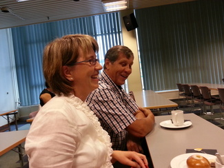 ![]() Puheenjohtaja Tuula Suomalainen ja hallituksen jäsen Veijo Porkka odottavat mielenkiinnolla pääministeri Jyrki Kataisen puhetta. |